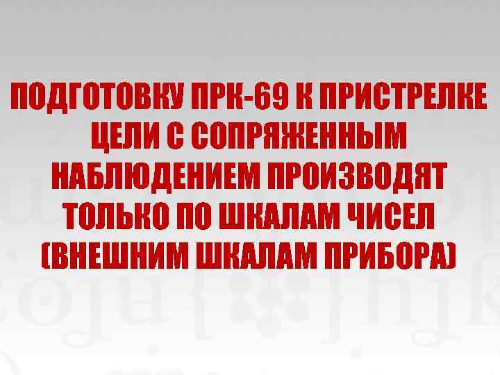 ПОДГОТОВКУ ПРК-69 К ПРИСТРЕЛКЕ ЦЕЛИ С СОПРЯЖЕННЫМ НАБЛЮДЕНИЕМ ПРОИЗВОДЯТ ТОЛЬКО ПО ШКАЛАМ ЧИСЕЛ (ВНЕШНИМ ШКАЛАМ ПРИБОРА)