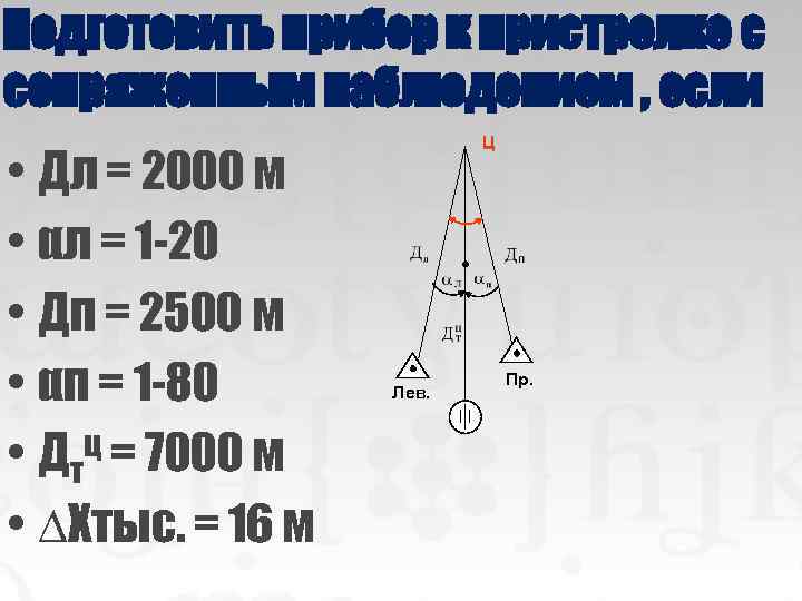 Подготовить прибор к пристрелке с сопряженным наблюдением , если • Дл = 2000 м • αл = 1 -20 • Дп = 2500 м • αп = 1 -80 • Дтц = 7000 м • ∆Хтыс. = 16 м Ц Лев. Пр.