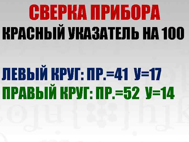 СВЕРКА ПРИБОРА КРАСНЫЙ УКАЗАТЕЛЬ НА 100 ЛЕВЫЙ КРУГ: ПР. =41 У=17 ПРАВЫЙ КРУГ: ПР. =52 У=14