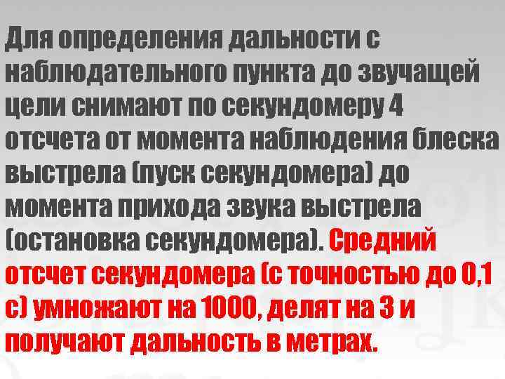 Для определения дальности с наблюдательного пункта до звучащей цели снимают по секундомеру 4 отсчета от момента наблюдения блеска выстрела (пуск секундомера) до момента прихода звука выстрела (остановка секундомера). Средний отсчет секундомера (с точностью до 0, 1 с) умножают на 1000, делят на 3 и получают дальность в метрах.