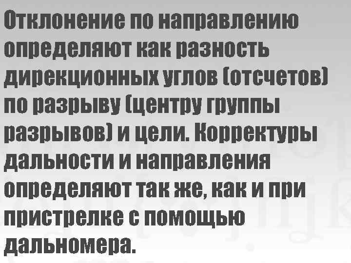 Отклонение по направлению определяют как разность дирекционных углов (отсчетов) по разрыву (центру группы разрывов) и цели. Корректуры дальности и направления определяют так же, как и пристрелке с помощью дальномера.
