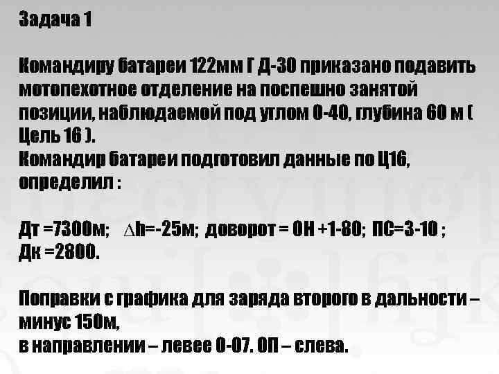 Задача 1 Командиру батареи 122 мм Г Д-30 приказано подавить мотопехотное отделение на поспешно занятой позиции, наблюдаемой под углом 0 -40, глубина 60 м ( Цель 16 ). Командир батареи подготовил данные по Ц 16, определил : Дт =7300 м; ∆h=-25 м; доворот = ОН +1 -80; ПС=3 -10 ; Дк =2800. Поправки с графика для заряда второго в дальности – минус 150 м, в направлении – левее 0 -07. ОП – слева.