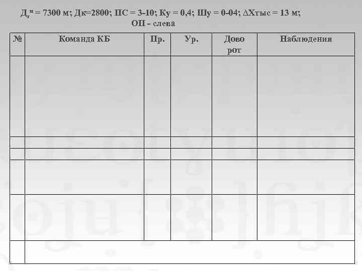 Дтц = 7300 м; Дк=2800; ПС = 3 -10; Ку = 0, 4; Шу = 0 -04; ∆Хтыс = 13 м; ОП - слева № Команда КБ Пр. Ур. Дово рот Наблюдения