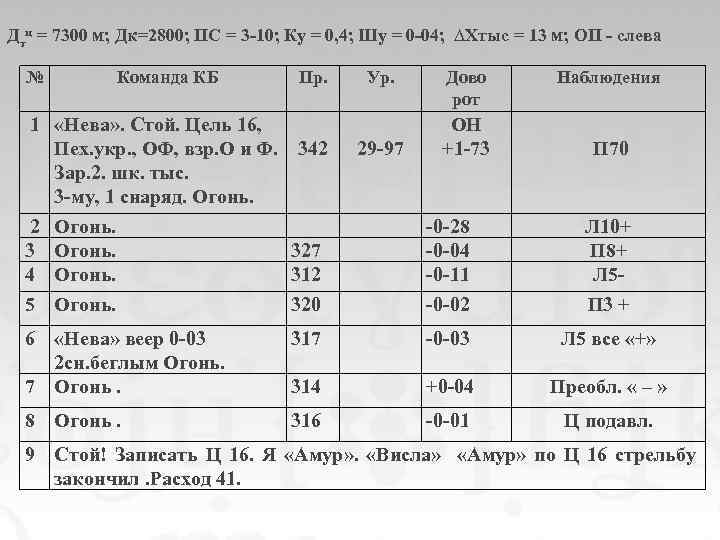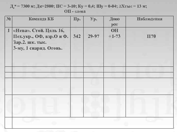 Дтц = 7300 м; Дк=2800; ПС = 3 -10; Ку = 0, 4; Шу = 0 -04; ∆Хтыс = 13 м; ОП - слева № Команда КБ Пр. 1 «Нева» . Стой. Цель 16, Пех. укр. , ОФ, взр. О и Ф. 342 Зар. 2. шк. тыс. 3 -му, 1 снаряд. Огонь. Ур. 29 -97 Дово рот ОН +1 -73 Наблюдения П 70
