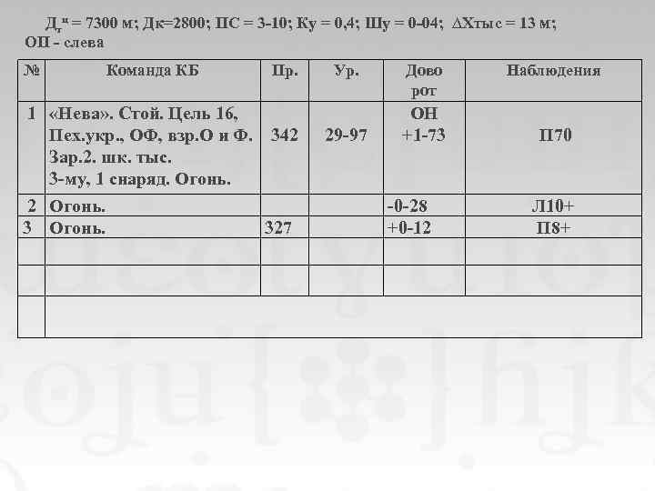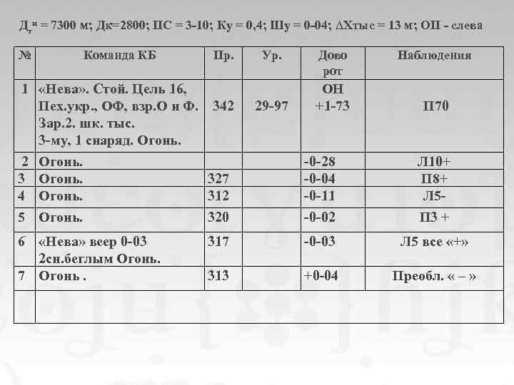 Дтц = 7300 м; Дк=2800; ПС = 3 -10; Ку = 0, 4; Шу = 0 -04; ∆Хтыс = 13 м; ОП - слева № Команда КБ Пр. 1 «Нева» . Стой. Цель 16, Пех. укр. , ОФ, взр. О и Ф. 342 Зар. 2. шк. тыс. 3 -му, 1 снаряд. Огонь. 2 Огонь. 327 Ур. 29 -97 Дово рот ОН +1 -73 -0 -28 +0 -12 Наблюдения П 70 Л 10+ П 8+