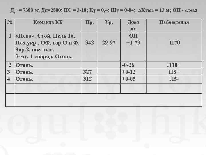 Дтц = 7300 м; Дк=2800; ПС = 3 -10; Ку = 0, 4; Шу = 0 -04; ∆Хтыс = 13 м; ОП - слева № Команда КБ Пр. 1 «Нева» . Стой. Цель 16, Пех. укр. , ОФ, взр. О и Ф. 342 Зар. 2. шк. тыс. 3 -му, 1 снаряд. Огонь. 2 Огонь. 327 4 Огонь. 312 Ур. 29 -97 Дово рот ОН +1 -73 -0 -28 +0 -12 +0 -05 Наблюдения П 70 Л 10+ П 8+ Л 5 -