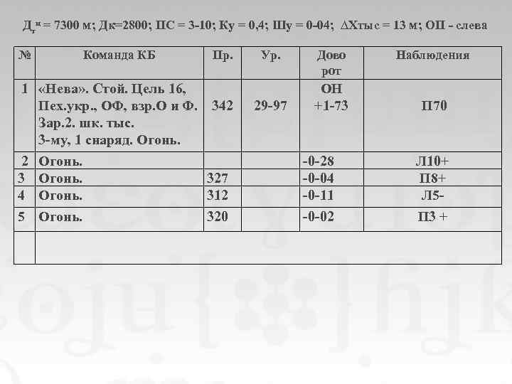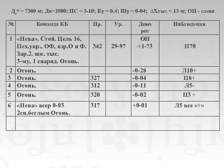 Дтц = 7300 м; Дк=2800; ПС = 3 -10; Ку = 0, 4; Шу = 0 -04; ∆Хтыс = 13 м; ОП - слева № Команда КБ Пр. 1 «Нева» . Стой. Цель 16, Пех. укр. , ОФ, взр. О и Ф. 342 Зар. 2. шк. тыс. 3 -му, 1 снаряд. Огонь. 2 Огонь. 327 4 Огонь. 312 5 Огонь. 320 Ур. 29 -97 Дово рот ОН +1 -73 Наблюдения П 70 -0 -28 -0 -04 -0 -11 Л 10+ П 8+ Л 5 - -0 -02 П 3 +