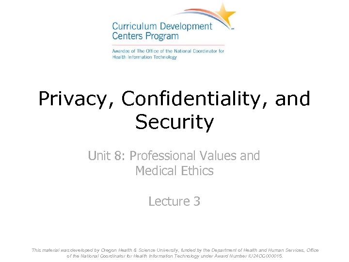Privacy, Confidentiality, and Security Unit 8: Professional Values and Medical Ethics Lecture 3 This material was developed by Oregon Health & Science University, funded by the Department of Health and Human Services, Office of the National Coordinator for Health Information Technology under Award Number IU 24 OC 000015.