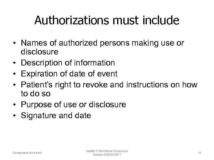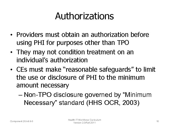 Authorizations • Providers must obtain an authorization before using PHI for purposes other than TPO • They may not condition treatment on an individual’s authorization • CEs must make “reasonable safeguards” to limit the use or disclosure of PHI to the minimum amount necessary – Non-TPO disclosure governed by “Minimum Necessary” standard (HHS OCR, 2003) Component 2/Unit 8 -3 Health IT Workforce Curriculum Version 2. 0/Fall 2011 10