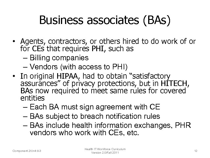 Business associates (BAs) • Agents, contractors, or others hired to do work of or for CEs that requires PHI, such as – Billing companies – Vendors (with access to PHI) • In original HIPAA, had to obtain “satisfactory assurances” of privacy protections, but in HITECH, BAs now required to meet same rules for covered entities – Each BA must sign agreement with CE – BAs subject to breach notification rules – BAs include health information exchanges, PHR vendors who work with CEs, etc. Component 2/Unit 8 -3 Health IT Workforce Curriculum Version 2. 0/Fall 2011 12