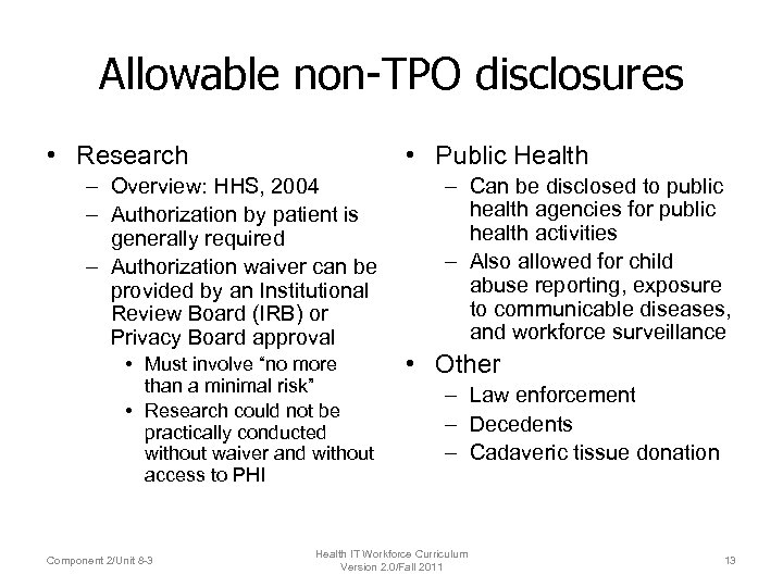 Allowable non-TPO disclosures • Research • Public Health – Overview: HHS, 2004 – Authorization by patient is generally required – Authorization waiver can be provided by an Institutional Review Board (IRB) or Privacy Board approval • Must involve “no more than a minimal risk” • Research could not be practically conducted without waiver and without access to PHI Component 2/Unit 8 -3 – Can be disclosed to public health agencies for public health activities – Also allowed for child abuse reporting, exposure to communicable diseases, and workforce surveillance • Other – Law enforcement – Decedents – Cadaveric tissue donation Health IT Workforce Curriculum Version 2. 0/Fall 2011 13