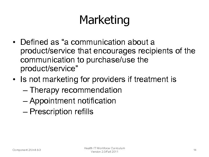 Marketing • Defined as “a communication about a product/service that encourages recipients of the communication to purchase/use the product/service” • Is not marketing for providers if treatment is – Therapy recommendation – Appointment notification – Prescription refills Component 2/Unit 8 -3 Health IT Workforce Curriculum Version 2. 0/Fall 2011 14