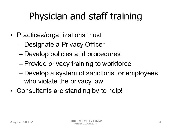 Physician and staff training • Practices/organizations must – Designate a Privacy Officer – Develop policies and procedures – Provide privacy training to workforce – Develop a system of sanctions for employees who violate the privacy law • Consultants are standing by to help! Component 2/Unit 8 -3 Health IT Workforce Curriculum Version 2. 0/Fall 2011 15