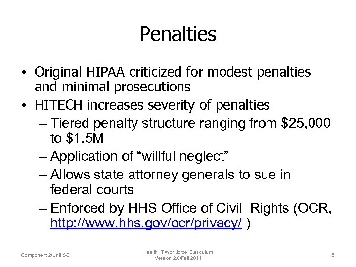 Penalties • Original HIPAA criticized for modest penalties and minimal prosecutions • HITECH increases severity of penalties – Tiered penalty structure ranging from $25, 000 to $1. 5 M – Application of “willful neglect” – Allows state attorney generals to sue in federal courts – Enforced by HHS Office of Civil Rights (OCR, http: //www. hhs. gov/ocr/privacy/ ) Component 2/Unit 8 -3 Health IT Workforce Curriculum Version 2. 0/Fall 2011 16