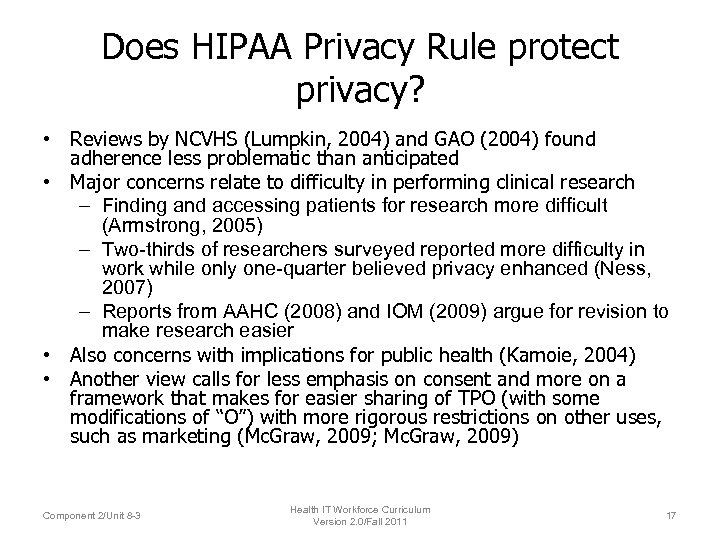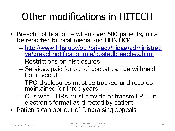 Does HIPAA Privacy Rule protect privacy? • Reviews by NCVHS (Lumpkin, 2004) and GAO (2004) found adherence less problematic than anticipated • Major concerns relate to difficulty in performing clinical research – Finding and accessing patients for research more difficult (Armstrong, 2005) – Two-thirds of researchers surveyed reported more difficulty in work while only one-quarter believed privacy enhanced (Ness, 2007) – Reports from AAHC (2008) and IOM (2009) argue for revision to make research easier • Also concerns with implications for public health (Kamoie, 2004) • Another view calls for less emphasis on consent and more on a framework that makes for easier sharing of TPO (with some modifications of “O”) with more rigorous restrictions on other uses, such as marketing (Mc. Graw, 2009; Mc. Graw, 2009) Component 2/Unit 8 -3 Health IT Workforce Curriculum Version 2. 0/Fall 2011 17