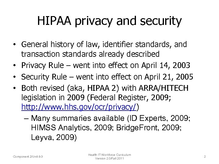 HIPAA privacy and security • General history of law, identifier standards, and transaction standards already described • Privacy Rule – went into effect on April 14, 2003 • Security Rule – went into effect on April 21, 2005 • Both revised (aka, HIPAA 2) with ARRA/HITECH legislation in 2009 (Federal Register, 2009; http: //www. hhs. gov/ocr/privacy/) – Many summaries available (ID Experts, 2009; HIMSS Analytics, 2009; Bridge. Front, 2009; Leyva, 2009) Component 2/Unit 8 -3 Health IT Workforce Curriculum Version 2. 0/Fall 2011 2