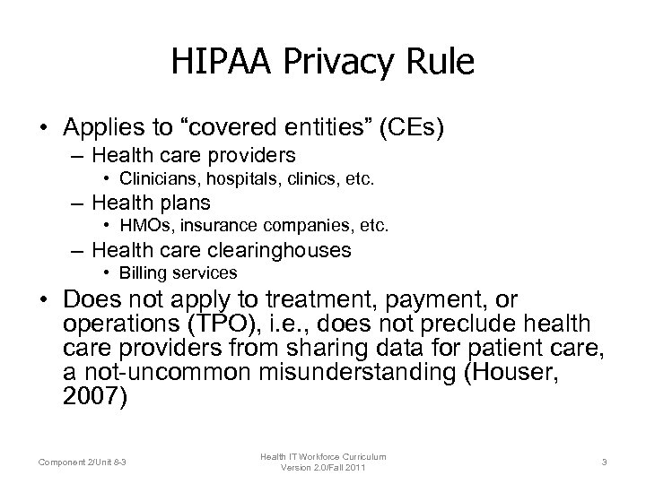 HIPAA Privacy Rule • Applies to “covered entities” (CEs) – Health care providers • Clinicians, hospitals, clinics, etc. – Health plans • HMOs, insurance companies, etc. – Health care clearinghouses • Billing services • Does not apply to treatment, payment, or operations (TPO), i. e. , does not preclude health care providers from sharing data for patient care, a not-uncommon misunderstanding (Houser, 2007) Component 2/Unit 8 -3 Health IT Workforce Curriculum Version 2. 0/Fall 2011 3