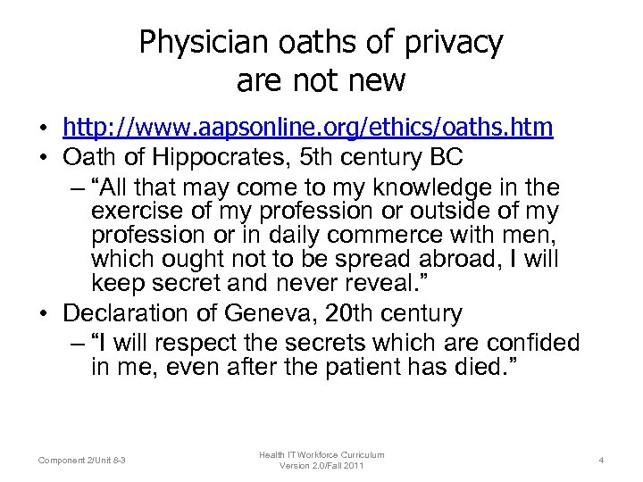 Physician oaths of privacy are not new • http: //www. aapsonline. org/ethics/oaths. htm • Oath of Hippocrates, 5 th century BC – “All that may come to my knowledge in the exercise of my profession or outside of my profession or in daily commerce with men, which ought not to be spread abroad, I will keep secret and never reveal. ” • Declaration of Geneva, 20 th century – “I will respect the secrets which are confided in me, even after the patient has died. ” Component 2/Unit 8 -3 Health IT Workforce Curriculum Version 2. 0/Fall 2011 4