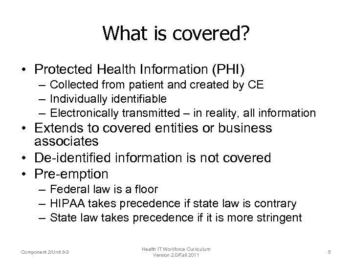 What is covered? • Protected Health Information (PHI) – Collected from patient and created by CE – Individually identifiable – Electronically transmitted – in reality, all information • Extends to covered entities or business associates • De-identified information is not covered • Pre-emption – Federal law is a floor – HIPAA takes precedence if state law is contrary – State law takes precedence if it is more stringent Component 2/Unit 8 -3 Health IT Workforce Curriculum Version 2. 0/Fall 2011 5