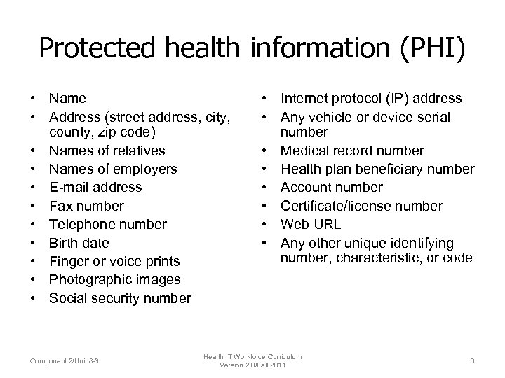 Protected health information (PHI) • Name • Address (street address, city, county, zip code) • Names of relatives • Names of employers • E-mail address • Fax number • Telephone number • Birth date • Finger or voice prints • Photographic images • Social security number Component 2/Unit 8 -3 • Internet protocol (IP) address • Any vehicle or device serial number • Medical record number • Health plan beneficiary number • Account number • Certificate/license number • Web URL • Any other unique identifying number, characteristic, or code Health IT Workforce Curriculum Version 2. 0/Fall 2011 6
