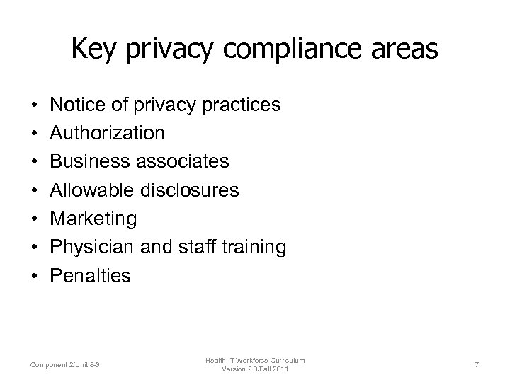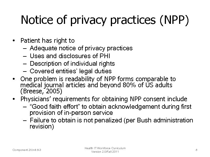 Key privacy compliance areas • • Notice of privacy practices Authorization Business associates Allowable disclosures Marketing Physician and staff training Penalties Component 2/Unit 8 -3 Health IT Workforce Curriculum Version 2. 0/Fall 2011 7