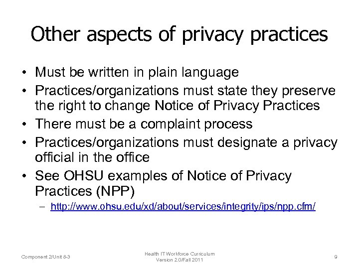 Notice of privacy practices (NPP) • Patient has right to – Adequate notice of privacy practices – Uses and disclosures of PHI – Description of individual rights – Covered entities’ legal duties • One problem is readability of NPP forms comparable to medical journal articles and beyond 80% of US adults (Breese, 2005) • Physicians’ requirements for obtaining NPP consent include – “Good faith effort” to obtain acknowledgement during first provision of in-person service – Failure to obtain is not penalized (per Bush administration revision) Component 2/Unit 8 -3 Health IT Workforce Curriculum Version 2. 0/Fall 2011 8