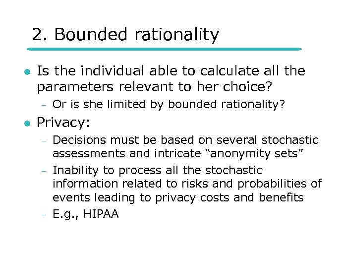 2. Bounded rationality l Is the individual able to calculate all the parameters relevant to her choice? – l Or is she limited by bounded rationality? Privacy: – – – Decisions must be based on several stochastic assessments and intricate “anonymity sets” Inability to process all the stochastic information related to risks and probabilities of events leading to privacy costs and benefits E. g. , HIPAA