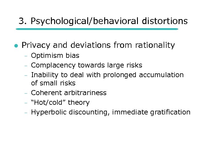 3. Psychological/behavioral distortions l Privacy and deviations from rationality – – – Optimism bias Complacency towards large risks Inability to deal with prolonged accumulation of small risks Coherent arbitrariness “Hot/cold” theory Hyperbolic discounting, immediate gratification