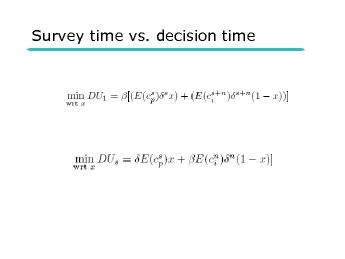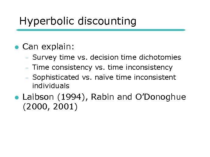 Hyperbolic discounting l Can explain: – – – l Survey time vs. decision time dichotomies Time consistency vs. time inconsistency Sophisticated vs. naïve time inconsistent individuals Laibson (1994), Rabin and O’Donoghue (2000, 2001)