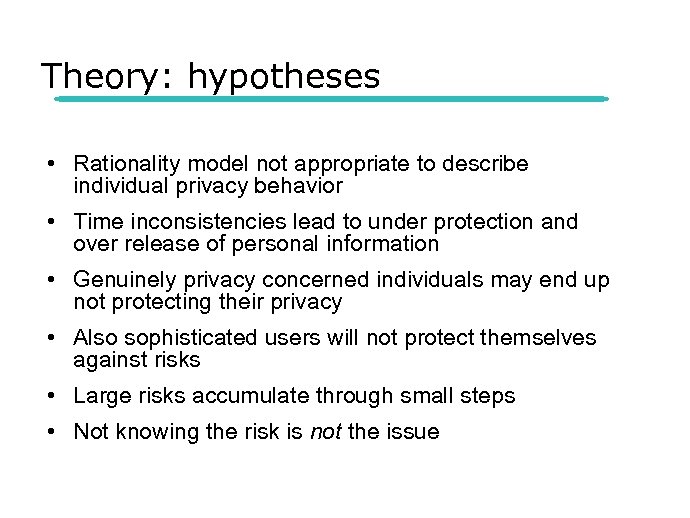 Theory: hypotheses • Rationality model not appropriate to describe individual privacy behavior • Time inconsistencies lead to under protection and over release of personal information • Genuinely privacy concerned individuals may end up not protecting their privacy • Also sophisticated users will not protect themselves against risks • Large risks accumulate through small steps • Not knowing the risk is not the issue