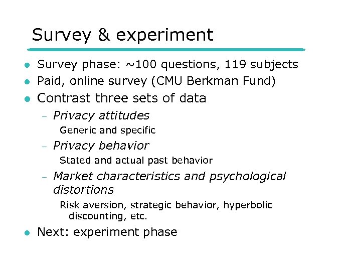 Survey & experiment l Survey phase: ~100 questions, 119 subjects Paid, online survey (CMU Berkman Fund) l Contrast three sets of data l – Privacy attitudes Generic and specific – Privacy behavior Stated and actual past behavior – Market characteristics and psychological distortions Risk aversion, strategic behavior, hyperbolic discounting, etc. l Next: experiment phase