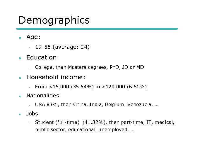 Demographics l Age: – l Education: – l From <15, 000 (35. 54%) to >120, 000 (6. 61%) Nationalities: – l College, then Masters degrees, Ph. D, JD or MD Household income: – l 19 -55 (average: 24) USA 83%, then China, India, Belgium, Venezuela, … Jobs: – Student (full-time) (41. 32%), then part-time, IT, medical, public sector, educational, unemployed, …