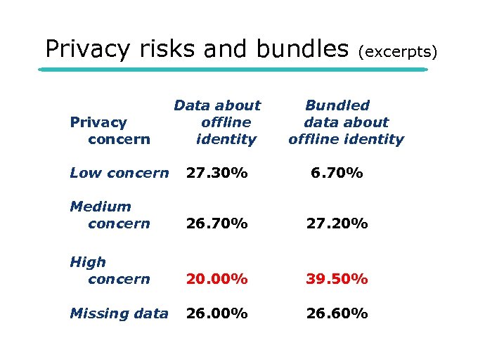 Privacy risks and bundles Privacy concern Data about offline identity (excerpts) Bundled data about offline identity Low concern 27. 30% 6. 70% Medium concern 26. 70% 27. 20% High concern 20. 00% 39. 50% Missing data 26. 00% 26. 60%