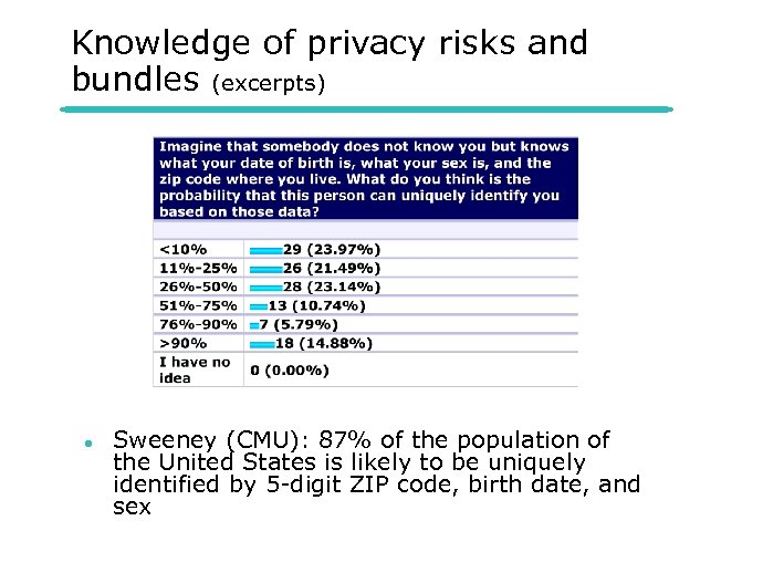 Knowledge of privacy risks and bundles (excerpts) l Sweeney (CMU): 87% of the population of the United States is likely to be uniquely identified by 5 -digit ZIP code, birth date, and sex
