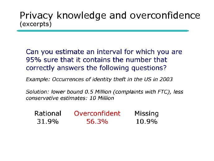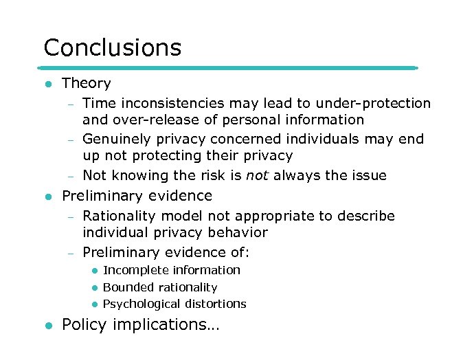 Conclusions l l Theory – Time inconsistencies may lead to under-protection and over-release of personal information – Genuinely privacy concerned individuals may end up not protecting their privacy – Not knowing the risk is not always the issue Preliminary evidence – Rationality model not appropriate to describe individual privacy behavior – Preliminary evidence of: l l Incomplete information Bounded rationality Psychological distortions Policy implications…