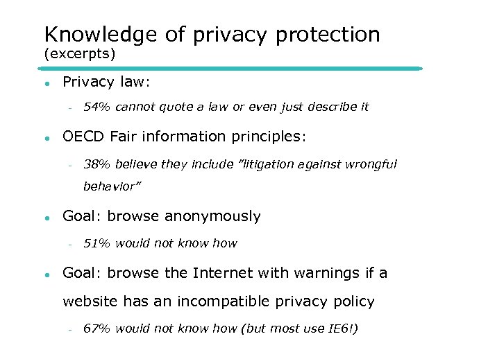 Knowledge of privacy protection (excerpts) l Privacy law: – l 54% cannot quote a law or even just describe it OECD Fair information principles: – 38% believe they include ”litigation against wrongful behavior” l Goal: browse anonymously – l 51% would not know how Goal: browse the Internet with warnings if a website has an incompatible privacy policy – 67% would not know how (but most use IE 6!)
