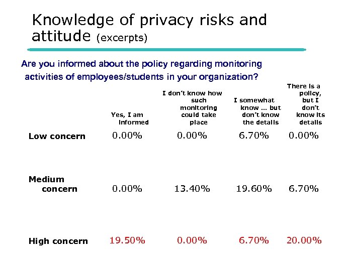Knowledge of privacy risks and attitude (excerpts) Are you informed about the policy regarding monitoring activities of employees/students in your organization? Yes, I am informed I don’t know how such monitoring could take place I somewhat know … but don’t know the details There is a policy, but I don’t know its details Low concern 0. 00% 6. 70% 0. 00% Medium concern 0. 00% 13. 40% 19. 60% 6. 70% 19. 50% 0. 00% 6. 70% 20. 00% High concern