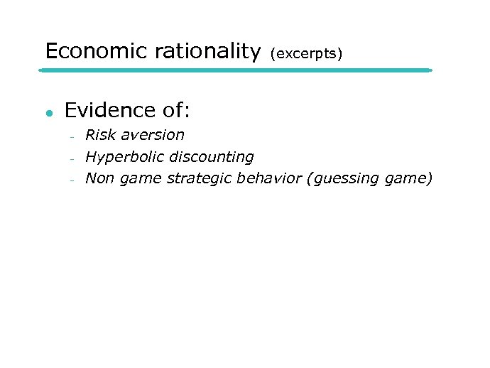 Economic rationality l (excerpts) Evidence of: – – – Risk aversion Hyperbolic discounting Non game strategic behavior (guessing game)