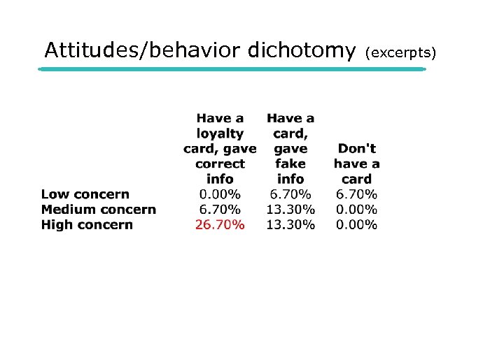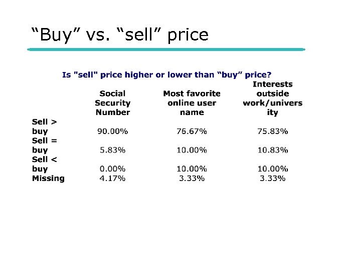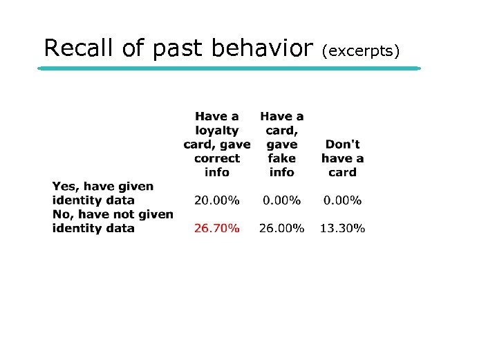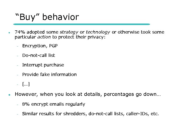 “Buy” behavior l 74% adopted some strategy or technology or otherwise took some particular action to protect their privacy: – – Do-not-call list – Interrupt purchase – Provide fake information – l Encryption, PGP […] However, when you look at details, percentages go down… – 8% encrypt emails regularly – Similar results for shredders, do-not-call lists, caller-IDs, etc.