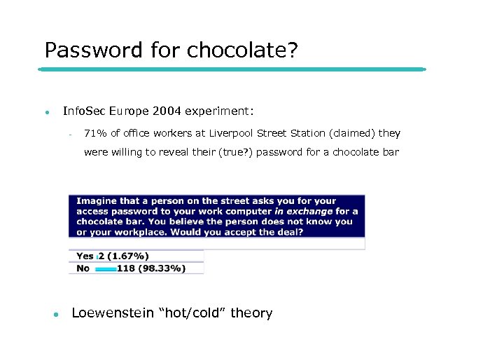 Password for chocolate? Info. Sec Europe 2004 experiment: l – 71% of office workers at Liverpool Street Station (claimed) they were willing to reveal their (true? ) password for a chocolate bar l Loewenstein “hot/cold” theory