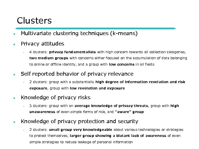 Clusters l Multivariate clustering techniques (k-means) l Privacy attitudes – 4 clusters: privacy fundamentalists with high concern towards all collection categories, two medium groups with concerns either focused on the accumulation of data belonging to online or offline identity, and a group with low concerns in all fields l Self reported behavior of privacy relevance – 2 clusters: group with a substantially high degree of information revelation and risk exposure, group with low revelation and exposure l Knowledge of privacy risks – 3 clusters: group with an average knowledge of privacy threats, group with high unawareness of even simple forms of risk, and “aware” group l Knowledge of privacy protection and security – 2 clusters: small group very knowledgeable about various technologies or strategies to protect themselves, larger group showing a blatant lack of awareness of even simple strategies to reduce leakage of personal information