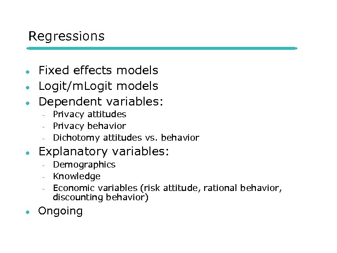 Regressions l l l Fixed effects models Logit/m. Logit models Dependent variables: – – – l Explanatory variables: – – – l Privacy attitudes Privacy behavior Dichotomy attitudes vs. behavior Demographics Knowledge Economic variables (risk attitude, rational behavior, discounting behavior) Ongoing