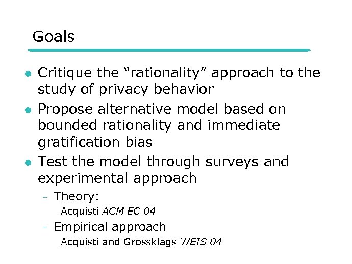 Goals l l l Critique the “rationality” approach to the study of privacy behavior Propose alternative model based on bounded rationality and immediate gratification bias Test the model through surveys and experimental approach – Theory: Acquisti ACM EC 04 – Empirical approach Acquisti and Grossklags WEIS 04