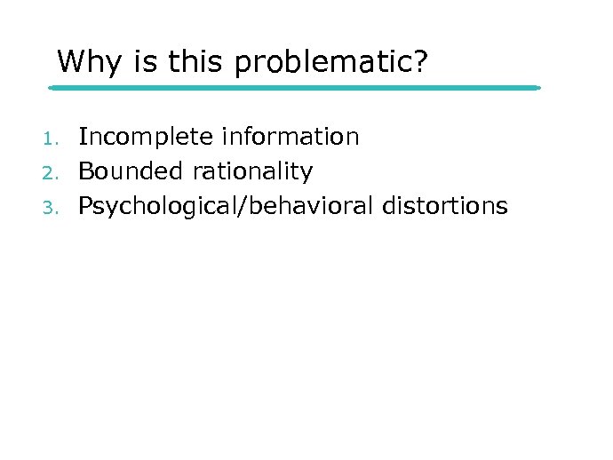 Why is this problematic? 1. 2. 3. Incomplete information Bounded rationality Psychological/behavioral distortions