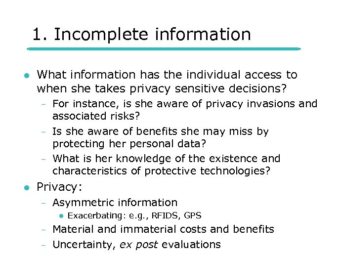 1. Incomplete information l What information has the individual access to when she takes privacy sensitive decisions? – – – l For instance, is she aware of privacy invasions and associated risks? Is she aware of benefits she may miss by protecting her personal data? What is her knowledge of the existence and characteristics of protective technologies? Privacy: – Asymmetric information l – – Exacerbating: e. g. , RFIDS, GPS Material and immaterial costs and benefits Uncertainty, ex post evaluations