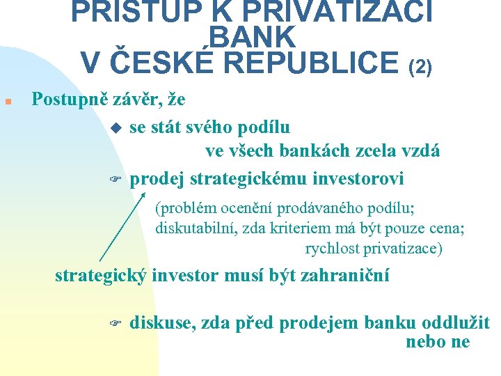 PŘÍSTUP K PRIVATIZACI BANK V ČESKÉ REPUBLICE (2) n Postupně závěr, že u se stát svého podílu ve všech bankách zcela vzdá F prodej strategickému investorovi (problém ocenění prodávaného podílu; diskutabilní, zda kriteriem má být pouze cena; rychlost privatizace) strategický investor musí být zahraniční F diskuse, zda před prodejem banku oddlužit nebo ne