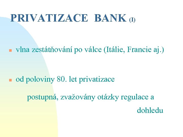 PRIVATIZACE BANK (I) n vlna zestátňování po válce (Itálie, Francie aj. ) n od poloviny 80. let privatizace postupná, zvažovány otázky regulace a dohledu