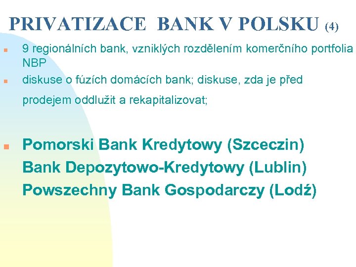 PRIVATIZACE BANK V POLSKU (3) n 9 regionálních bank, vzniklých rozdělením komerčního portfolia NBP n Bank Gdański (Gdańsk) zahájení koncem roku 1995; malá banka; nízká cena 24 PZL n Powszechny Bank Kredytowy (Warszawa) 1996; velká banka; open tender vyhrála společnost Samsung, tendr zrušen a za sníženou cenu banka prodána domácímu konsorciu firem n Bank Zachodni (Wroclaw) 1996; menší banka