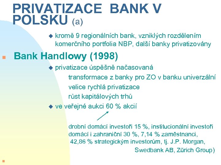 PRIVATIZACE BANK V POLSKU (a) u n kromě 9 regionálních bank, vzniklých rozdělením komerčního portfolia NBP, další banky privatizovány Bank Handlowy (1998) privatizace úspěšně načasovaná transformace z banky pro ZO v banku univerzální velice rychlá privatizace růst kapitálových trhů u ve veřejné aukci 60 % akcií u drobní domácí investoři 15 %, institucionální investoři domácí i zahraniční 30 %, 7, 14 % zaměstnanci, 42, 86 % strategickým investorům, tj. J. P. Morgan, Swedbank AB, Zűrich Group) n