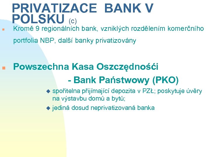 PRIVATIZACE BANK V POLSKU (c) n Kromě 9 regionálních bank, vzniklých rozdělením komerčního portfolia NBP, další banky privatizovány n Powszechna Kasa Oszczędnośći - Bank Państwowy (PKO) spořitelna přijímající depozita v PZŁ; poskytuje úvěry na výstavbu domů a bytů; u jediná dosud neprivatizovaná banka u